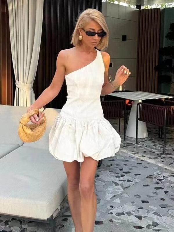 Deze speelse mini jurk met één schouder en plooirok biedt een elegante en comfortabele pasvorm. Ideaal voor zomerfeesten en chique uitjes, met een romantische ribbelstructuur.