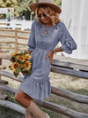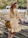 Deze charmante mini jurk met kantdetail en rimpelzoom biedt een elegante uitstraling en ultiem comfort. Perfect voor zowel casual als feestelijke gelegenheden, met een elastische taille en romantische stijl.