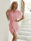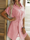 Deze stijlvolle mini jurk met knoopsluiting en een gedraaid knoopdesign biedt een comfortabele pasvorm. Ideaal voor zowel casual uitjes als semi-formele evenementen, met een effen gestreept patroon dat eenvoudig te combineren is.