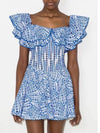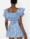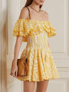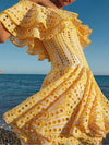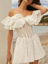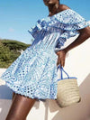 Deze elegante mini jurk met off-shoulder ontwerp en geometrisch patroon biedt een chique uitstraling. Perfect voor zomerse evenementen en speciale gelegenheden, met een nauwsluitende pasvorm en stijlvolle rimpelrand.