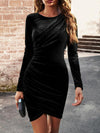 Deze luxueuze mini jurk met rimpeldesign en lange mouwen biedt een elegante uitstraling voor speciale gelegenheden. De nauwsluitende pasvorm flatteert je figuur en is perfect voor feestjes en avondjes uit.