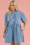 Deze casual en speelse mini jurk is gemaakt van duurzame denim stof en heeft charmante puff mouwen en een striksluiting aan de voorzijde. Perfect voor elke gelegenheid.