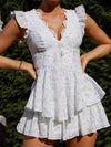 Deze speelse mini jurk met V-hals en bloemenprint biedt een elegante uitstraling met ruffled mouwen en een gelaagde rok. Perfect voor zomerse uitjes en speciale gelegenheden.