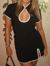 Deze stijlvolle mini jurk met V-hals en contrast trim biedt een verfijnde uitstraling. Perfect voor chique avonden, met een slanke pasvorm en een elegante split aan de voorzijde.