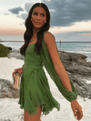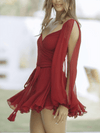 Deze elegante mini jurk met V-hals en doorzichtige mouwen biedt een flatterende pasvorm voor speciale gelegenheden. Perfect voor feesten, met een stijlvolle uitstraling en rimpelzoom die elke outfit compleet maakt.