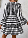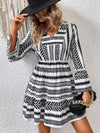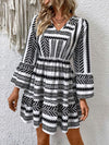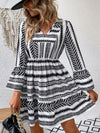 Deze stijlvolle mini jurk met V-hals en wijde mouwen biedt een comfortabele pasvorm. Het geometrische patroon maakt het perfect voor zowel casual als chique gelegenheden.