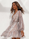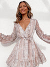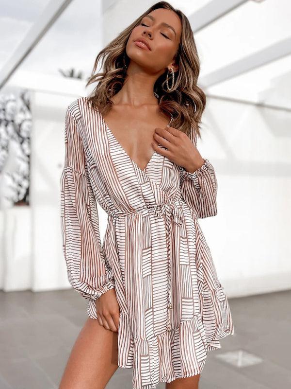 Deze speelse mini jurk met V-hals en gestreept patroon biedt een flatterende pasvorm en ultiem comfort. Perfect voor zowel casual uitjes als stijlvolle evenementen, met een elastische taille en rimpelzoom voor een elegante uitstraling.