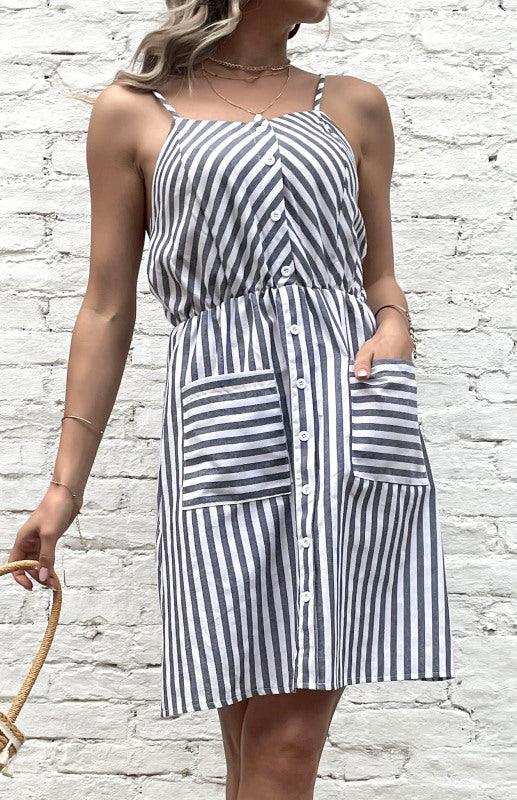 Deze stijlvolle mini jurk met V-hals en gestreept patroon biedt een comfortabele pasvorm en praktische zakken. Ideaal voor zomerse dagen en casual uitjes, met verstelbare schouderbanden voor extra gemak.