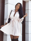 Deze stijlvolle mini jurk met V-hals en knoopsluiting biedt een elegante uitstraling en comfortabele pasvorm. Perfect voor zowel casual als formele gelegenheden, met een veelzijdig ontwerp dat eenvoudig te combineren is. Mini jurk, V-hals, effen kleur, knoopsluiting, A-lijn rok, elegante stijl, casual jurk, formele jurk, tailleband met strik, damesmode