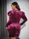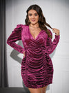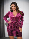 Deze verfijnde mini jurk met V-hals en lange mouwen is perfect voor speciale gelegenheden. De elastische taille en het rimpeldesign zorgen voor een flatterende pasvorm, terwijl het luxe velours een elegante uitstraling biedt.