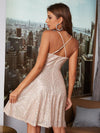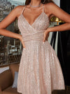 Deze glamoureuze mini jurk met V-hals en glanzende pailletten biedt een elegante uitstraling voor feestelijke gelegenheden. De comfortabele pasvorm en plooirok maken het ideaal voor avondkleding en speciale evenementen.