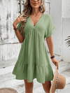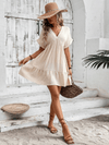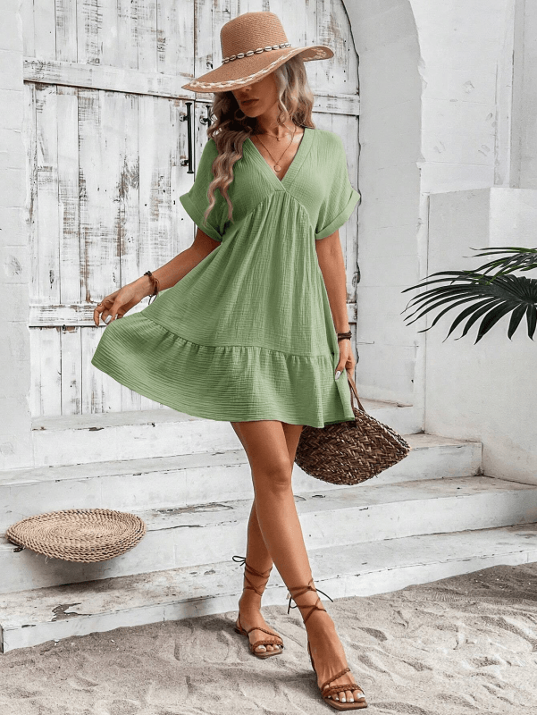 Deze stijlvolle mini jurk met V-hals en plooirok biedt een chique en comfortabele pasvorm. Ideaal voor zomerse uitjes en casual gelegenheden, met een elegante effen kleur.