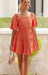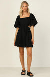 Deze stijlvolle mini jurk met vierkante hals en elastische taille biedt een comfortabele pasvorm. Ideaal voor zowel casual als semi-formele gelegenheden, met een speelse en veelzijdige uitstraling.