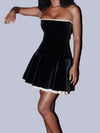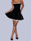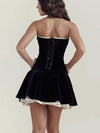 Deze strapless mini jurk van fluweel straalt tijdloze luxe uit. De uitlopende rok en comfortabele pasvorm maken het perfect voor cocktailfeesten en elegante evenementen.