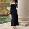 Deze off-shoulder jurk biedt een flexibele pasvorm en ademend materiaal, perfect voor zowel formele als casual gelegenheden. Geniet van comfort op warmere dagen met een subtiele, glamoureuze uitstraling.