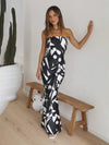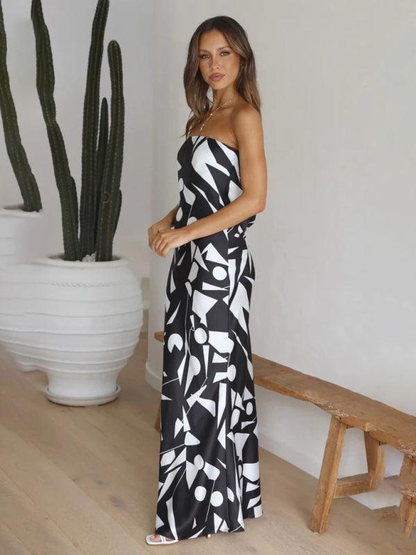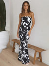 Deze moderne maxi jurk met een strapless ontwerp en gedurfde geometrische print biedt een elegante en stijlvolle uitstraling. Ideaal voor avondgelegenheden en stijlvolle uitjes, accentueert het de vrouwelijke silhouet.