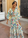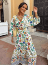 Deze elegante maxi jurk met V-hals en bloemenprint heeft een luchtige pasvorm en een bohemian uitstraling. Perfect voor tuinfeesten en stranduitjes, met een comfortabele hoge taille en twist front.