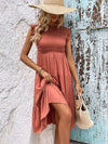 Deze stijlvolle midi jurk met V-hals en gerimpelde schouderdetails biedt een elegante en comfortabele pasvorm. Ideaal voor zomerse uitjes en casual gelegenheden, met een vloeiende laagjesrok en elastisch lijfje.